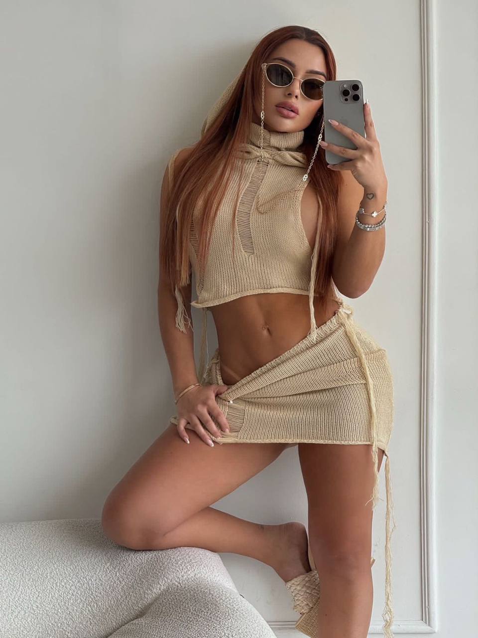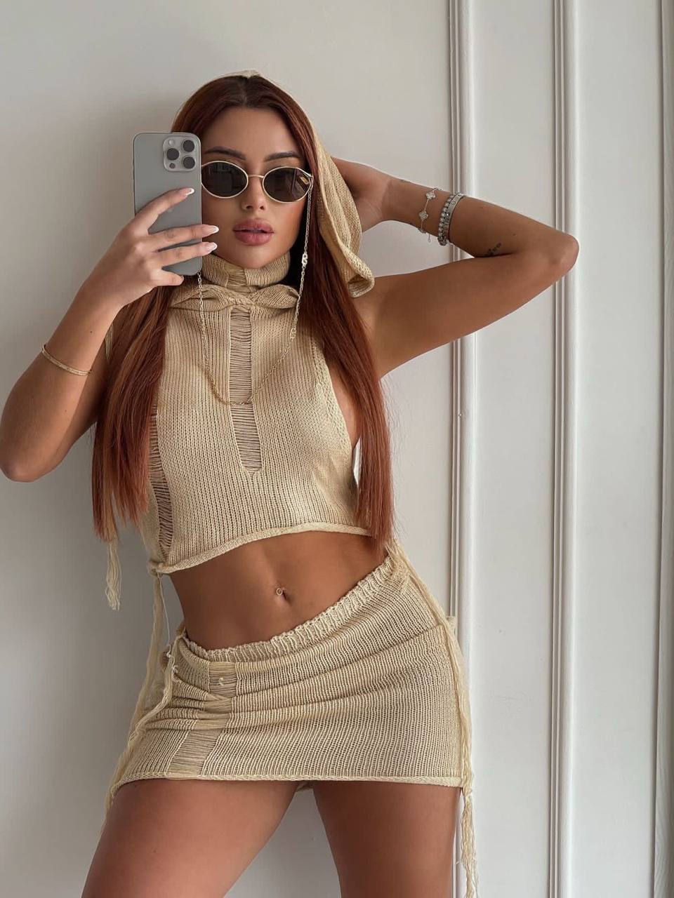 Conjunto tejido beige de dos piezas: top sin mangas con capucha y abertura frontal + falda mini con detalles deshilachados. Estilo urbano y atrevido, perfecto para destacar en eventos, fotos o salidas casuales con actitud. ¡Luce única y con estilo!