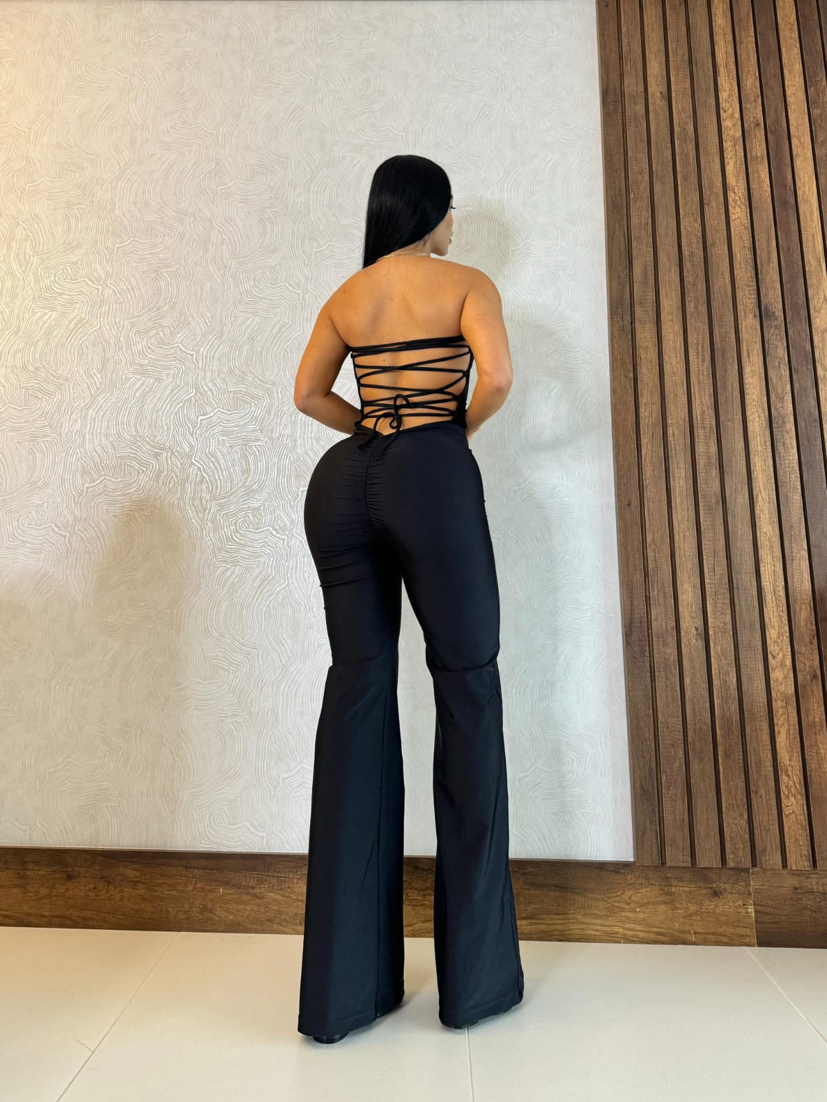 Un diseño elegante y moderno que combina sensualidad con comodidad. Este enterizo negro de pierna ancha resalta la silueta gracias a su espalda descubierta con tiras cruzadas ajustables y su corte ceñido en la cintura.