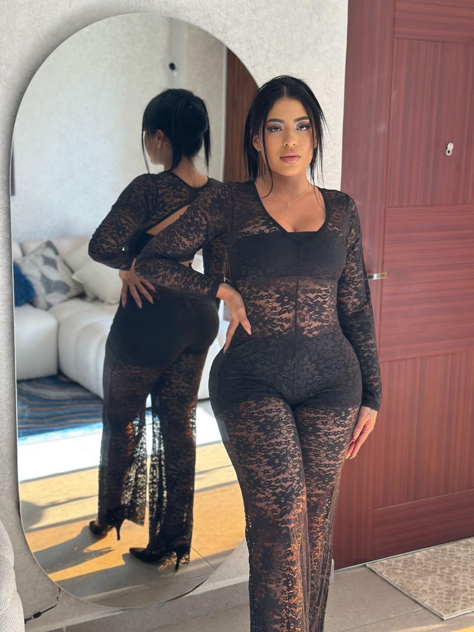 El diseño de manga larga aporta un toque de glamour, y la parte inferior estilo pantalón ofrece una caída ligera y femenina que eleva cualquier look. Ideal para noches especiales, sesiones de fotos o momentos donde quieras sentirte poderosa y única.