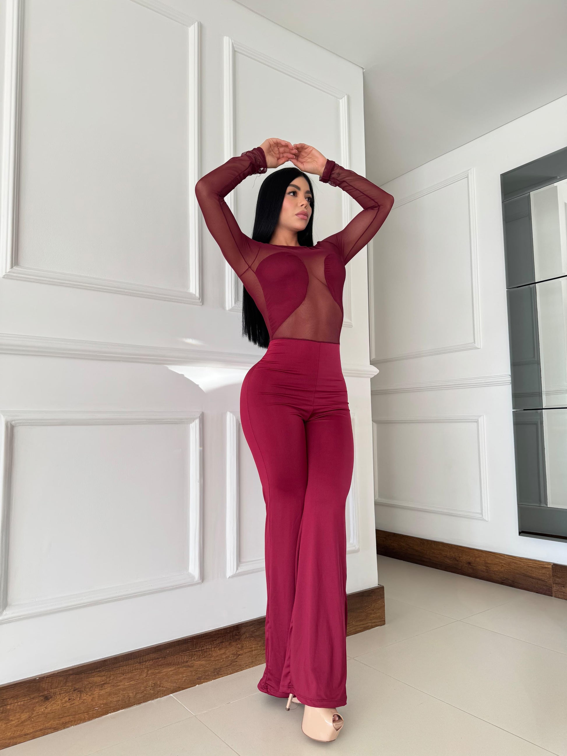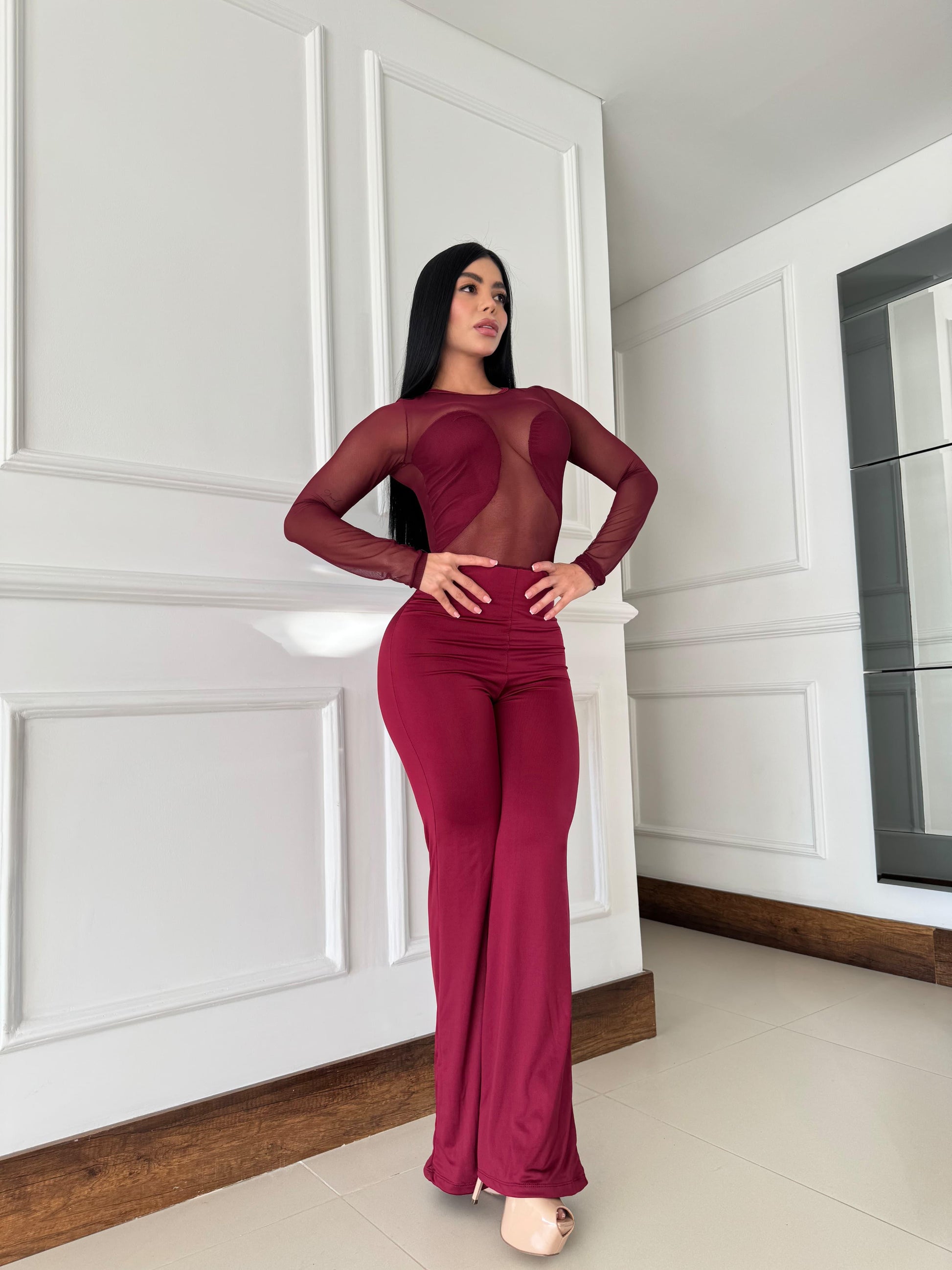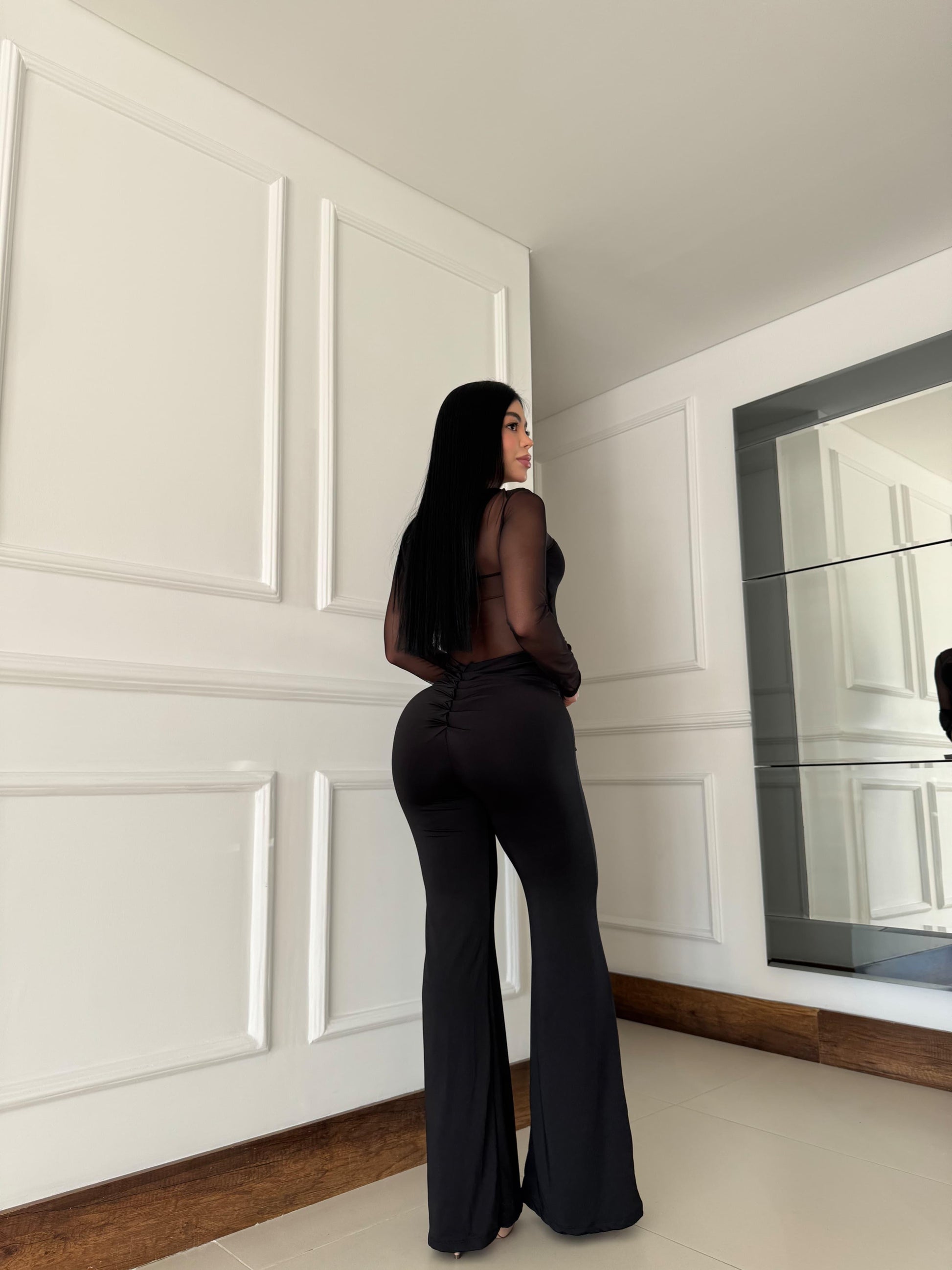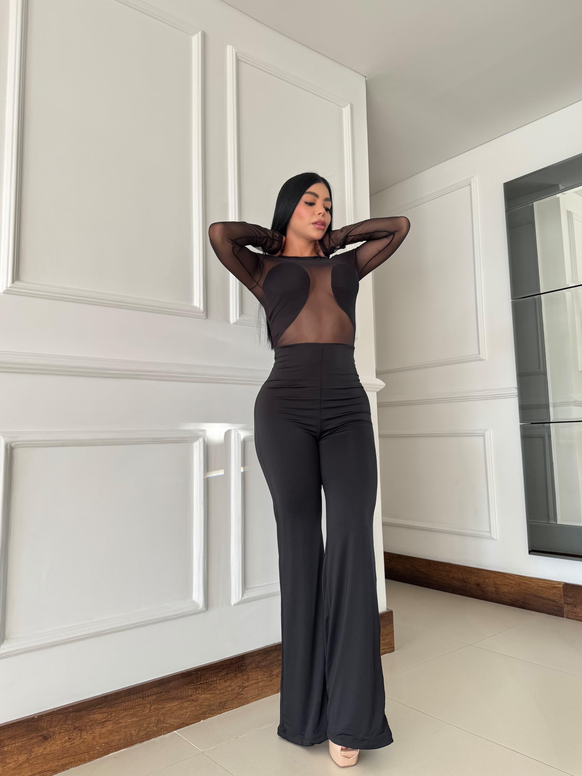 El Enterizo Maldivas es la definición perfecta de sensualidad y elegancia. Diseñado para resaltar la silueta femenina, combina malla semitransparente con cortes estratégicos que estilizan el torso y realzan el busto de forma sofisticada. Su diseño de manga larga y pantalón de bota amplia crea un look moderno, atrevido y ultra favorecedor.