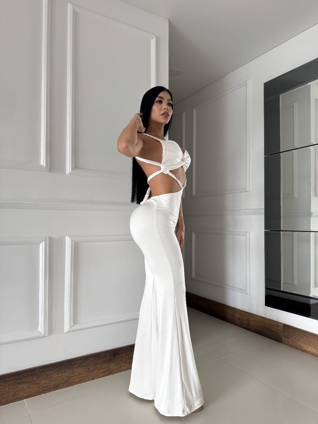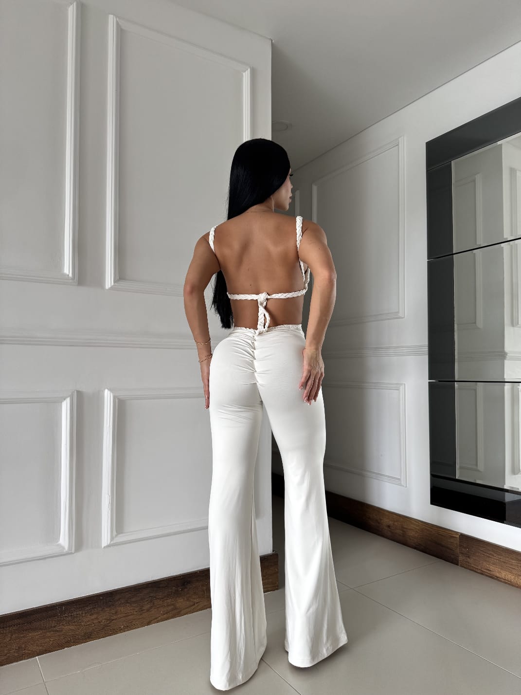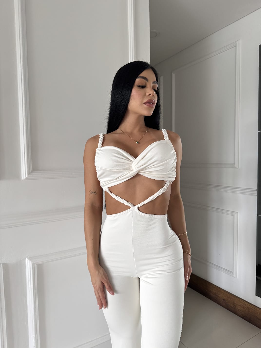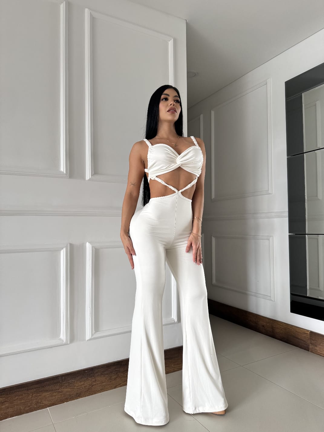 Un diseño moderno y atrevido que resalta la figura con total estilo. Este enterizo blanco de pierna ancha destaca por su top drapeado con tirantes finos y un corte cut out frontal que aporta sensualidad y elegancia en la misma prenda.