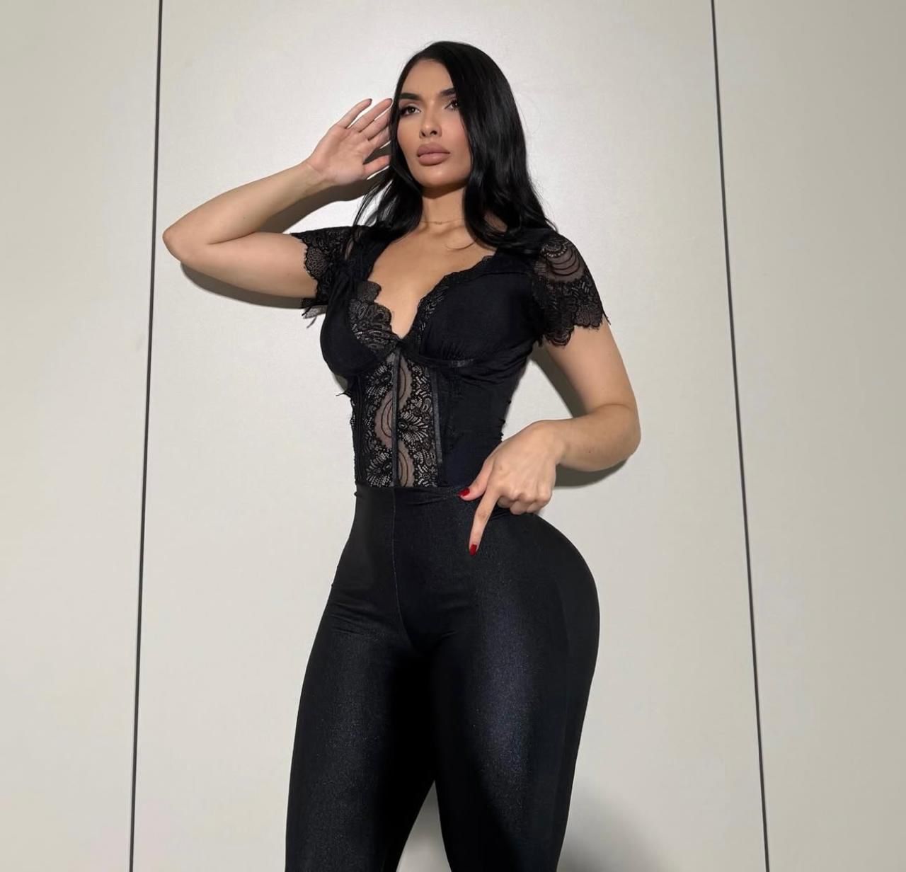 Un conjunto que combina elegancia con un toque atrevido. El body de encaje con transparencias y mangas delicadas resalta tu figura con sutileza y estilo, mientras que el legging de acabado brillante moldea tus curvas y alarga visualmente tus piernas.