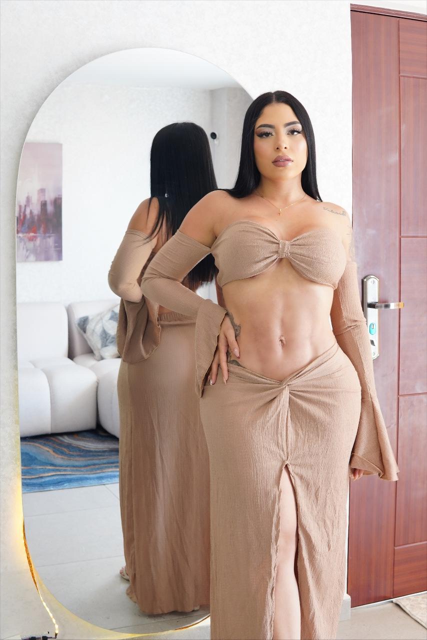 Este set de dos piezas combina sensualidad, frescura y una estética inspirada en la esencia boho-chic. Su diseño incluye un top bandeau con nudo delantero y mangas largas off-shoulder de caída suave, creando un efecto etéreo y femenino. La falda larga de tiro alto presenta un drapeado frontal con torcido central que estiliza la cintura y una abertura vertical que aporta movimiento y un toque irresistible.