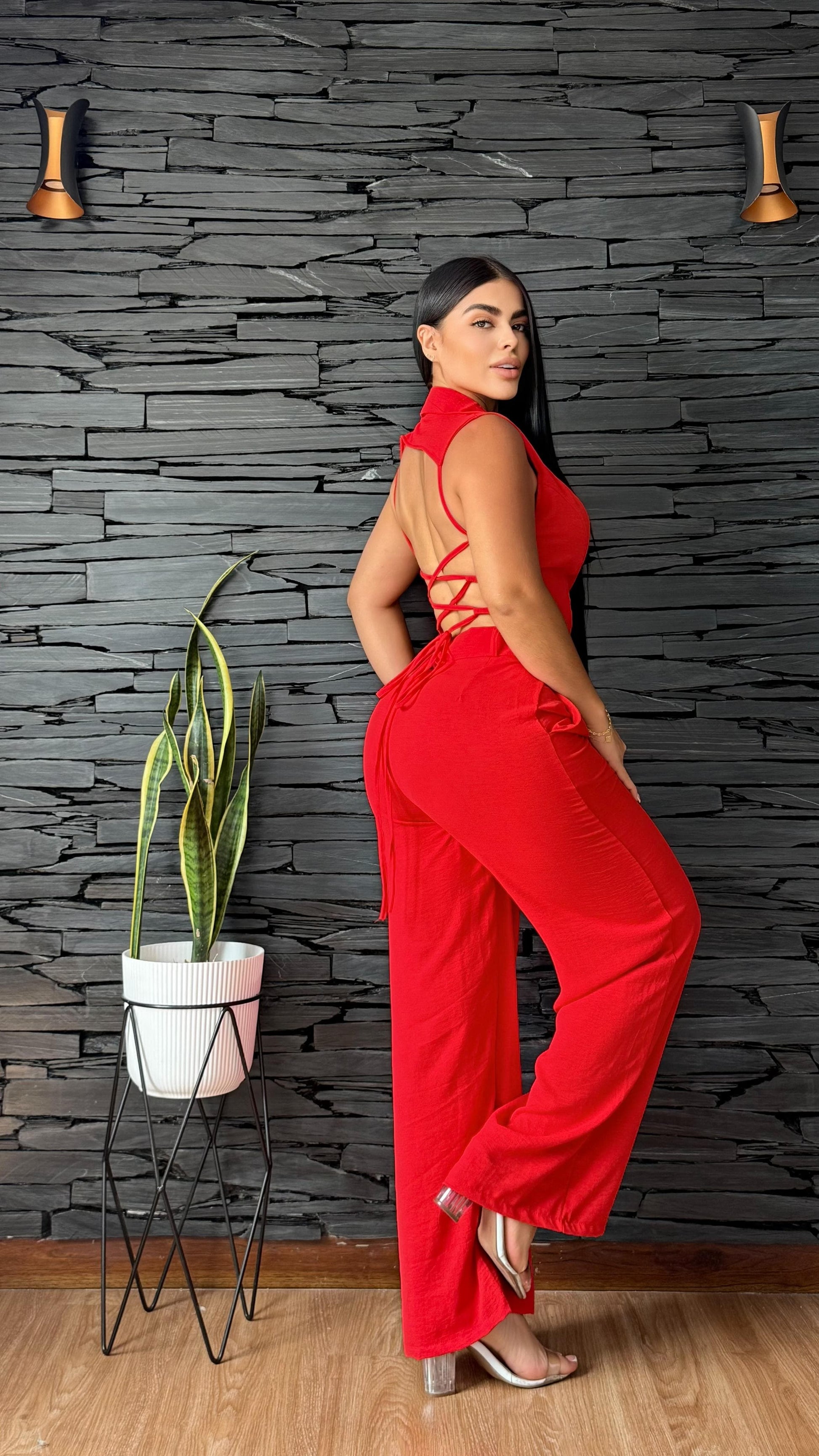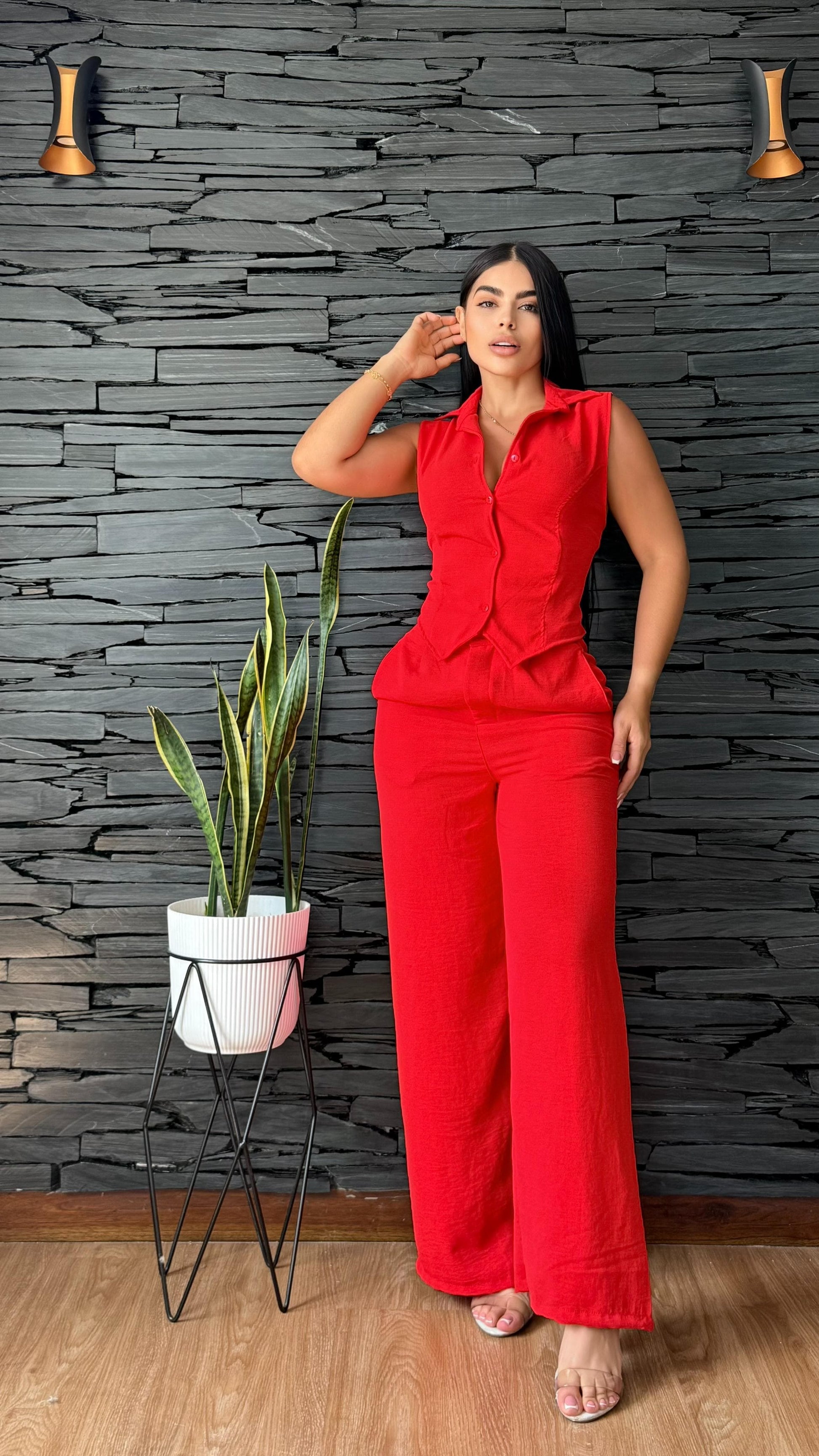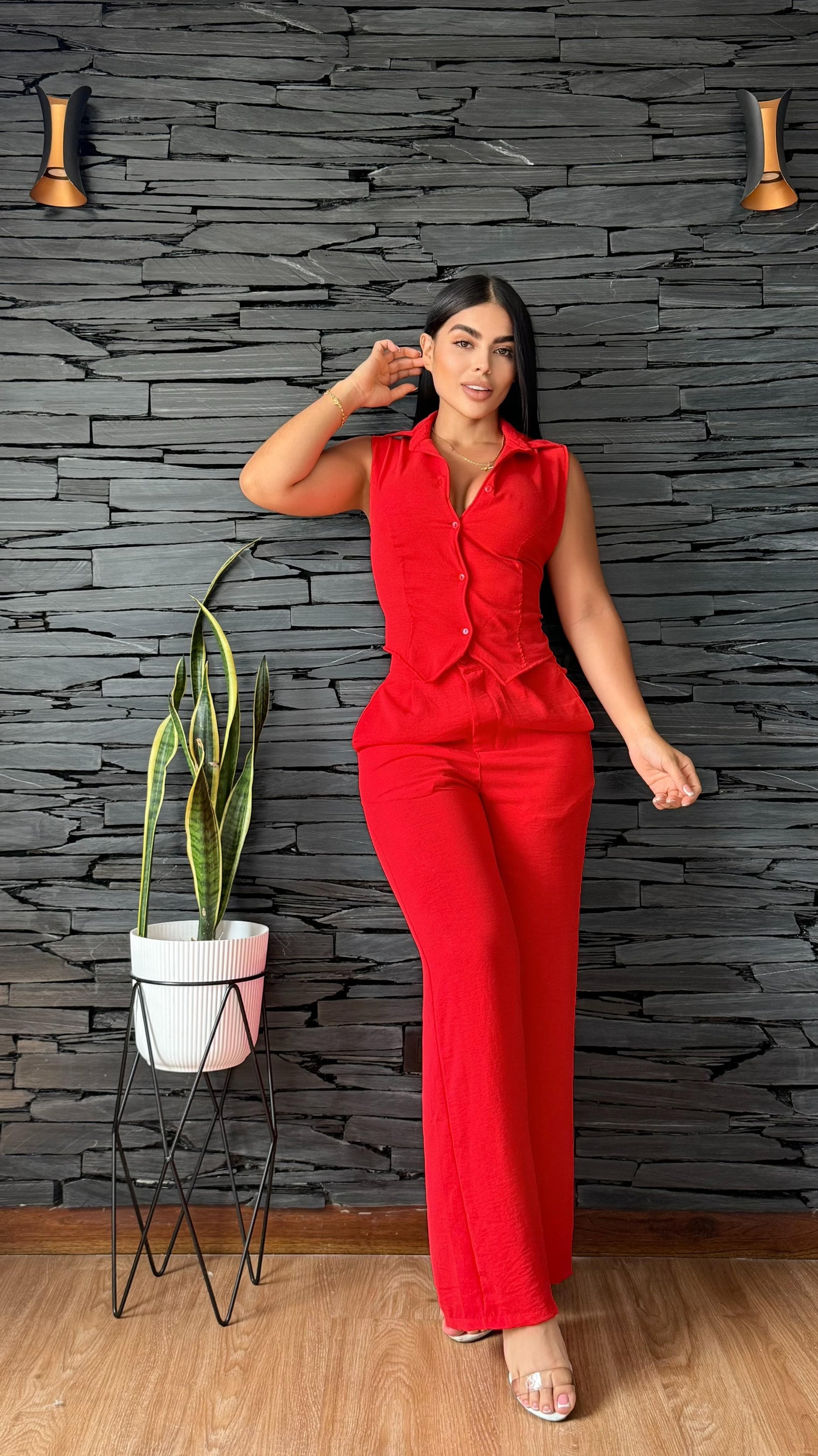 Este enterizo sin mangas es la mezcla perfecta entre sofisticación y frescura. Su diseño tipo camisa con botones frontales y cintura entallada resalta la figura de forma natural, mientras que el pantalón de corte recto aporta comodidad y un aire moderno ideal para el día a día o eventos casuales con estilo.