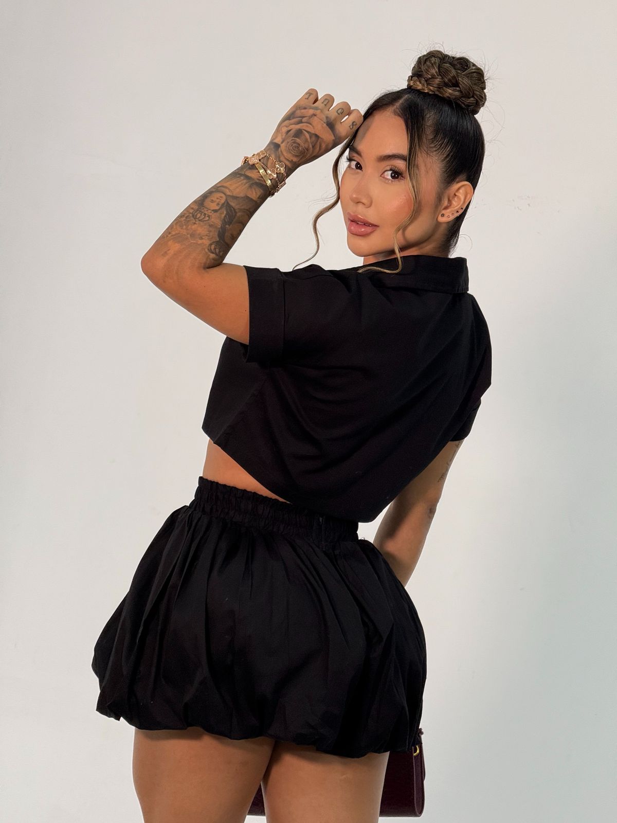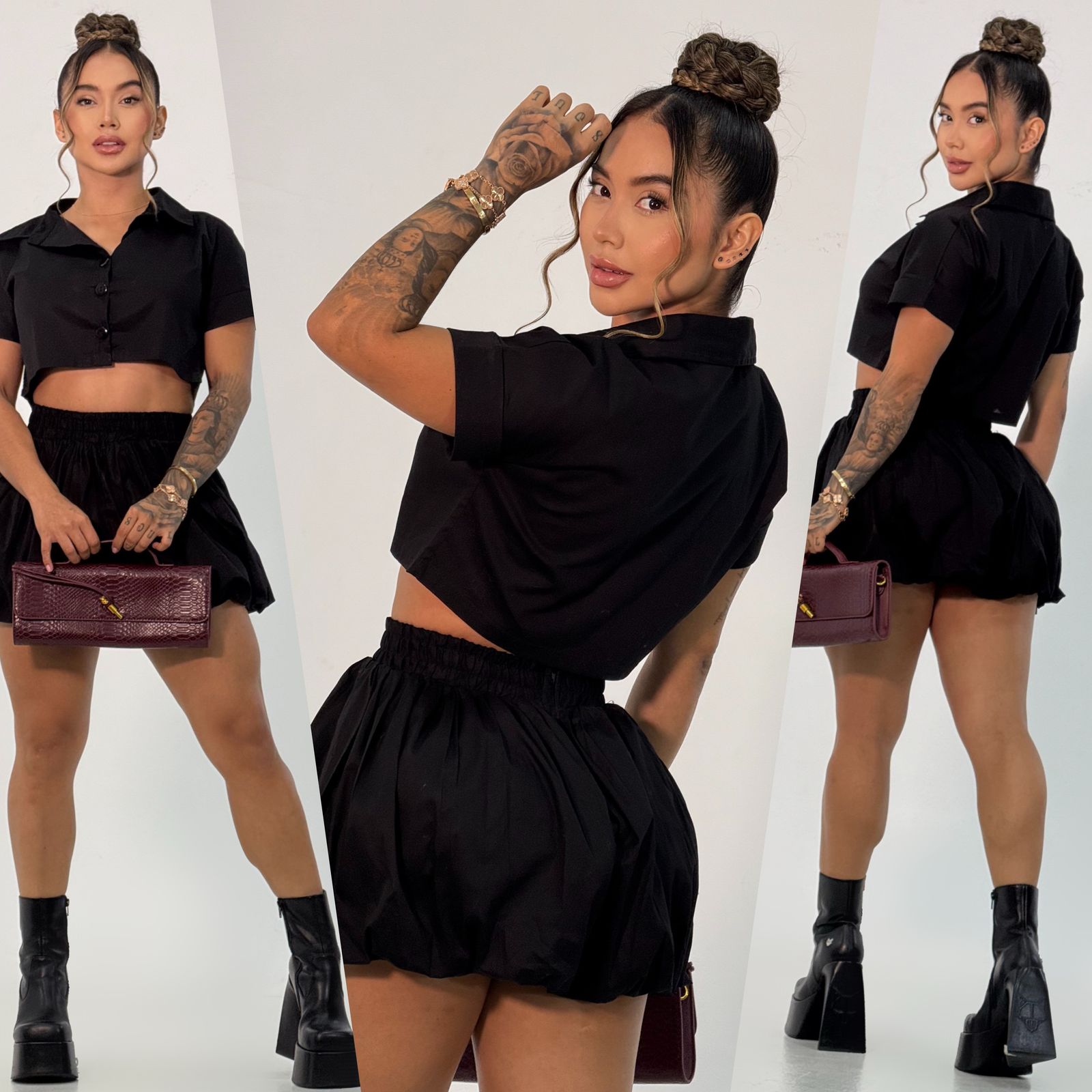 Este conjunto combina lo clásico con lo atrevido. La camisa tipo crop con cuello y botones aporta un toque estructurado, mientras que la falda estilo globito añade volumen y frescura para un look moderno y lleno de personalidad. Ideal para quienes buscan destacar con estilo en entornos urbanos o casuales.