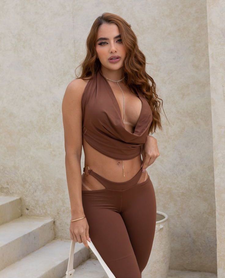 Este conjunto es pura actitud. Con un top de escote drapeado y amarre al cuello, y leggings con cortes laterales que realzan tu figura, es la combinación perfecta entre sensualidad y tendencia. Sus detalles con argollas metálicas añaden un toque audaz que te hará destacar en cualquier ocasión.