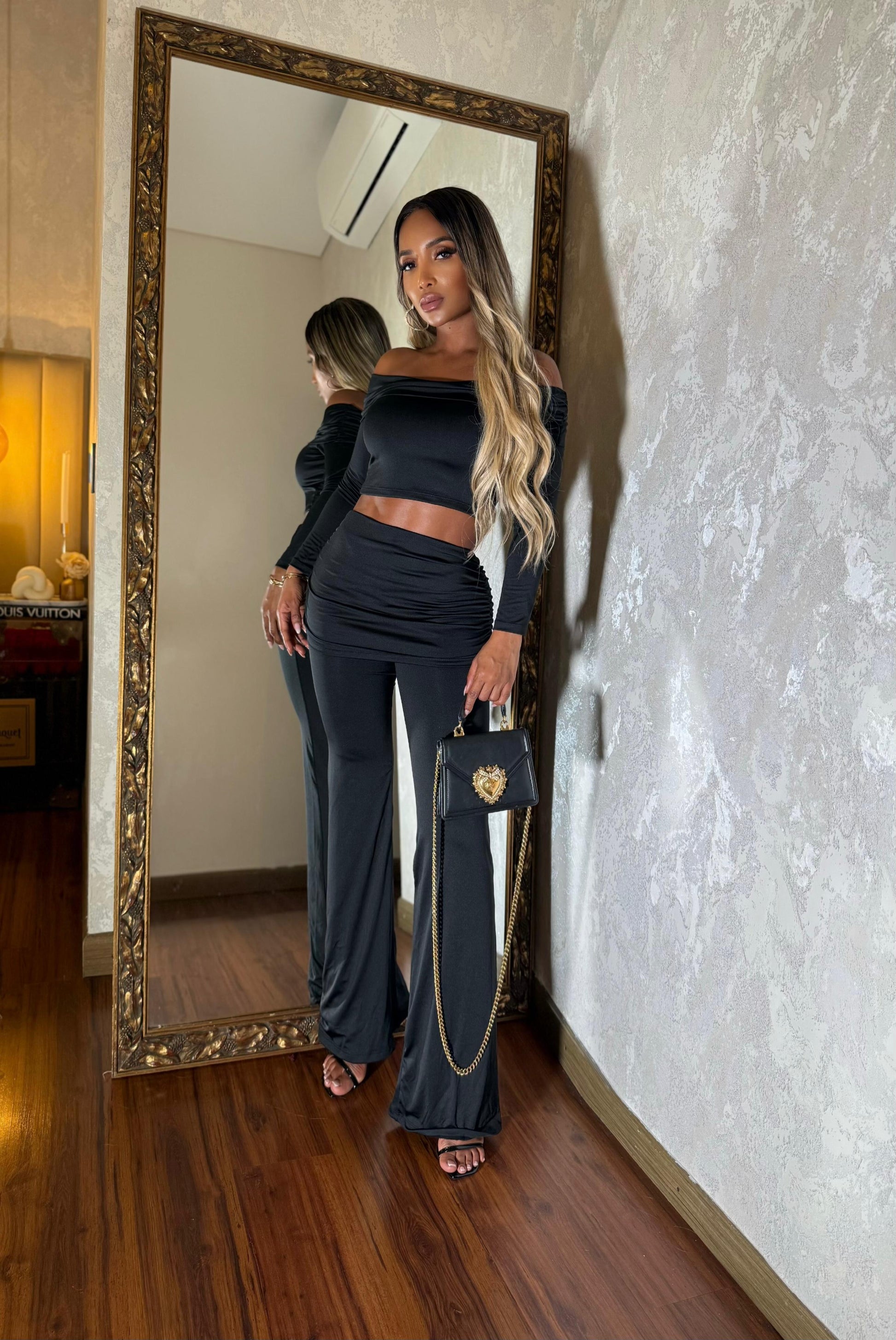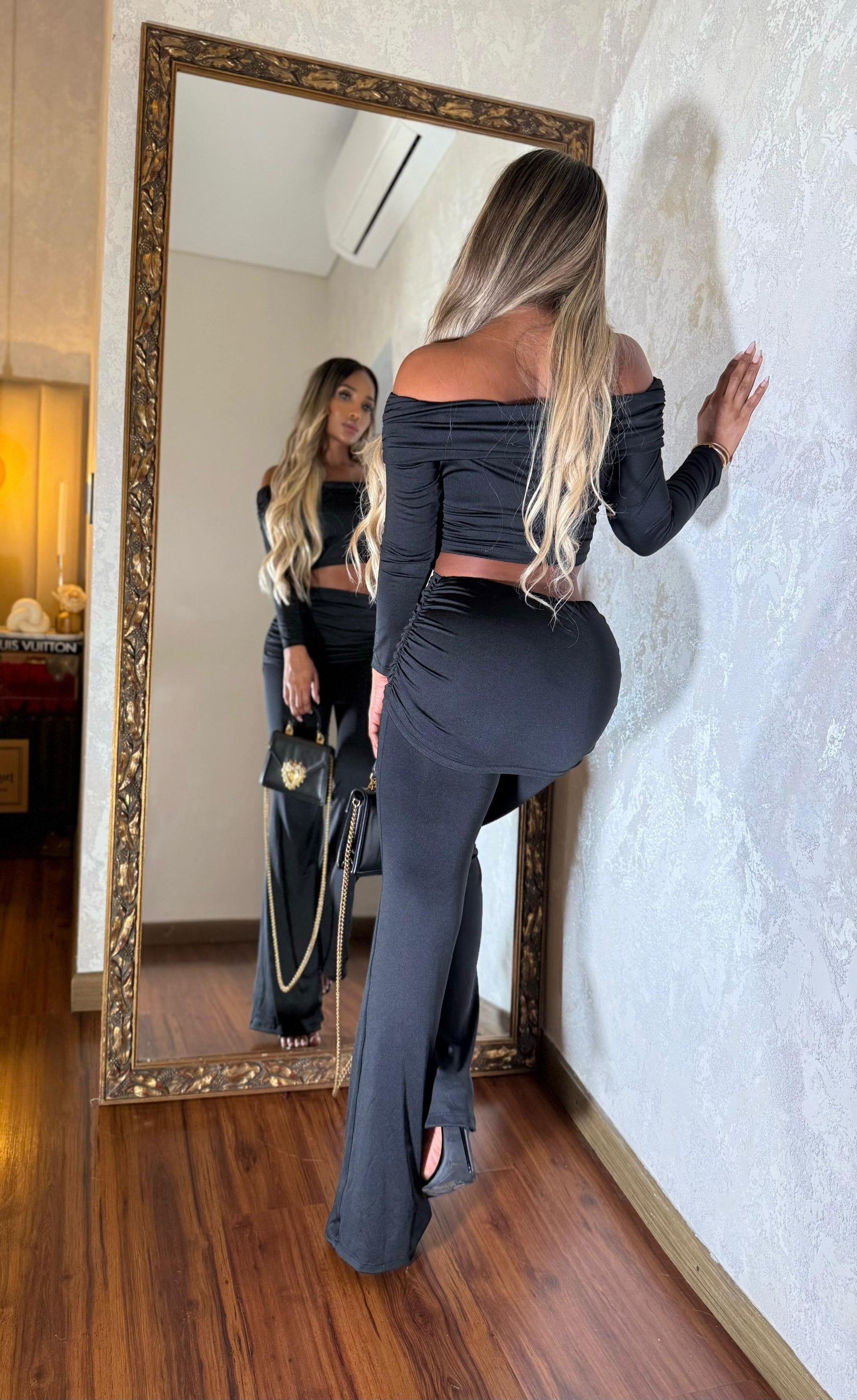 El set Rafaela es la definición de elegancia sensual. Compuesto por un top crop off shoulder de manga larga y pantalón de tiro alto con delicados drapeados laterales que estilizan la figura y realzan la silueta de forma sofisticada.
