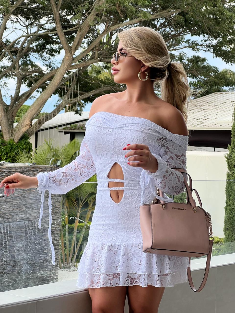 Este vestido es el equilibrio perfecto entre lo romántico y lo atrevido. Confeccionado en delicado encaje, su diseño off shoulder y abertura frontal con tiras cruzadas resaltan la silueta de forma sutil y femenina. Las mangas largas con moños ajustables y la falda de doble vuelo aportan movimiento y encanto a cada paso.
