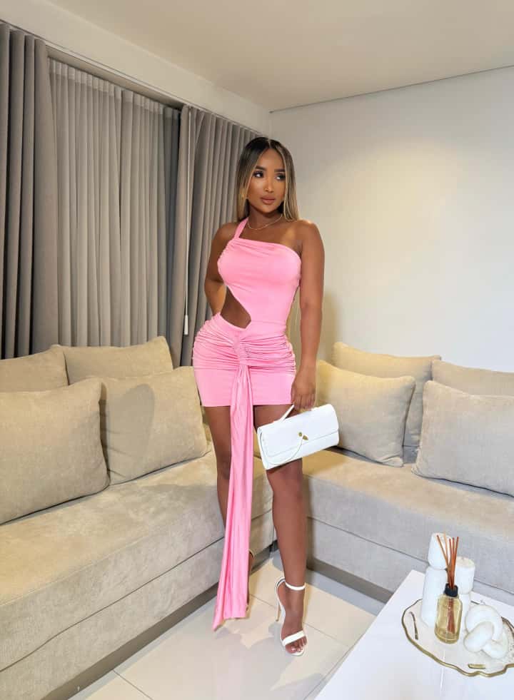Luce radiante con este vestido rosa asimétrico, perfecto para destacar en cualquier ocasión especial. Su diseño incluye un escote de un solo hombro y un cut out lateral que aporta un toque sensual y moderno sin perder elegancia.