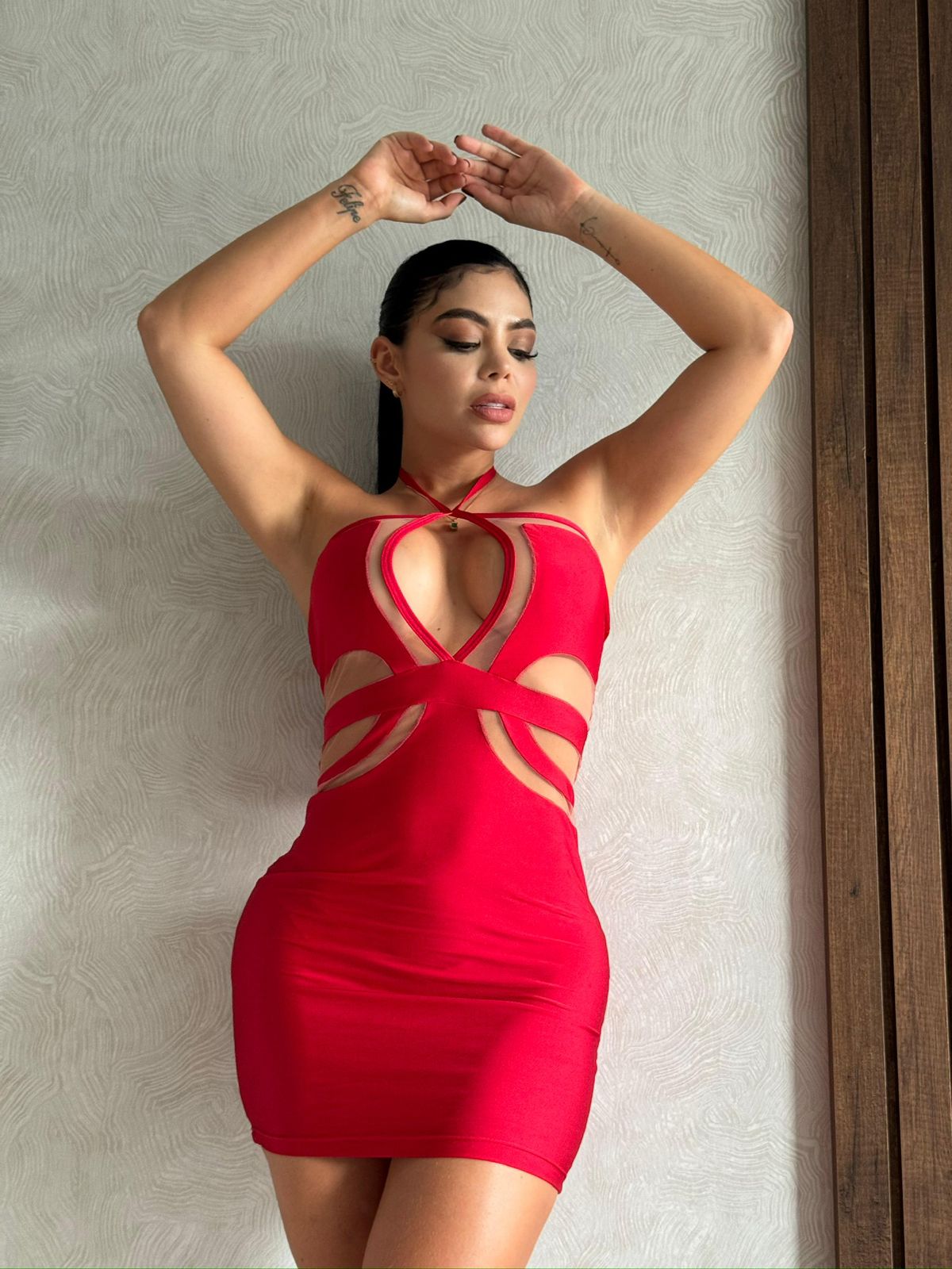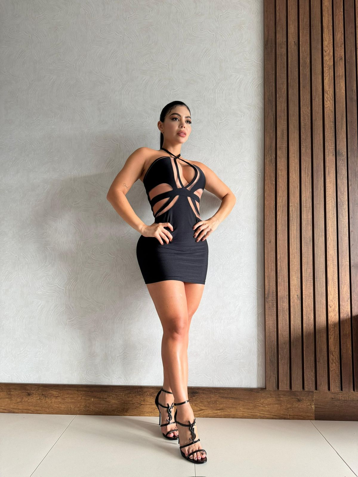 Mini vestido negro con cortes estratégicos y diseño de tiras cruzadas que realzan tu silueta. Perfecto para looks impactantes y noches inolvidables.