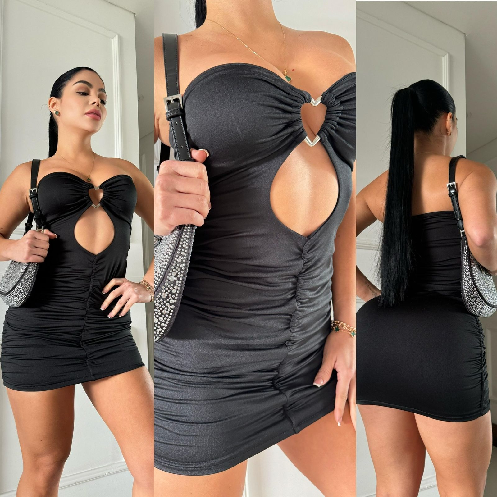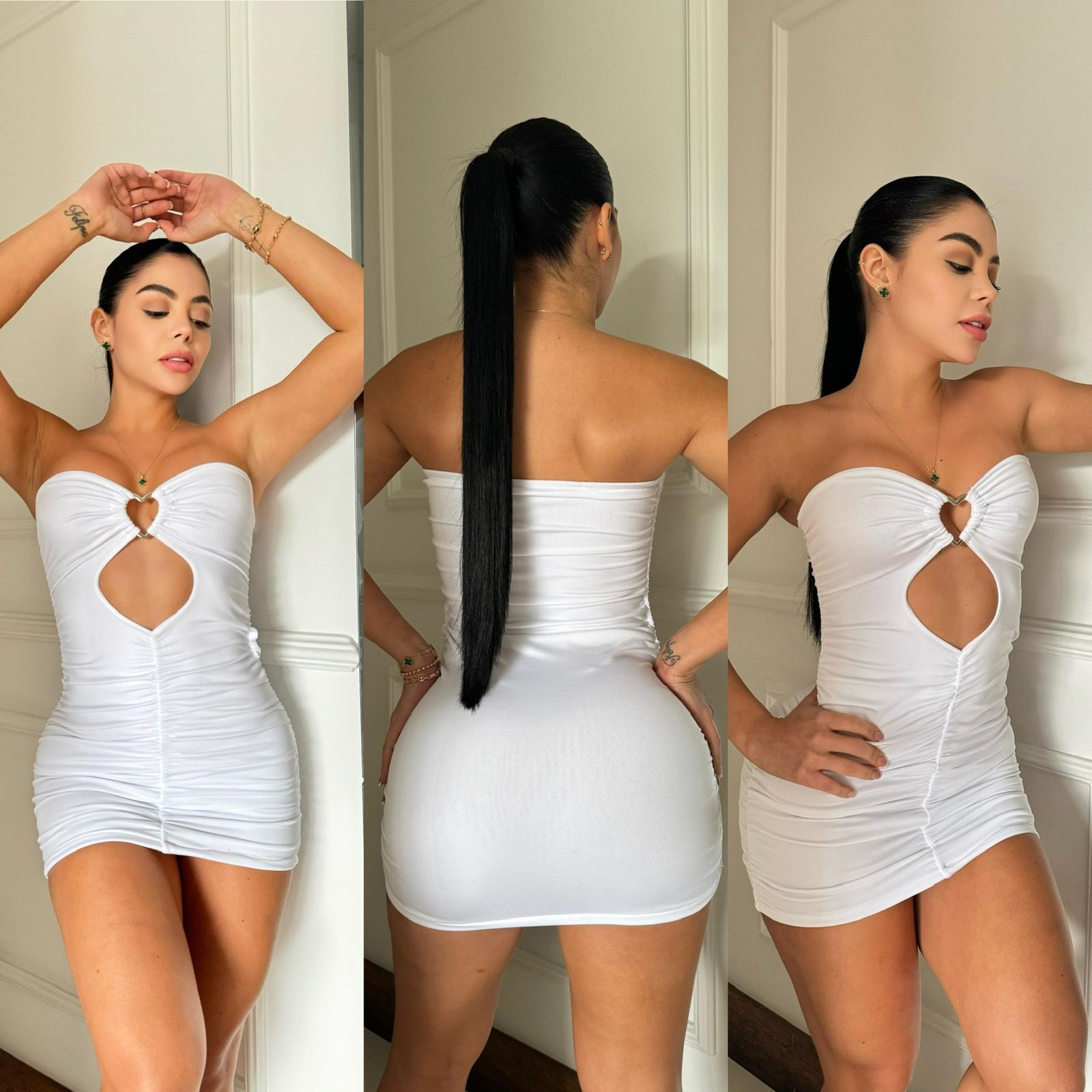 Mini vestido blanco strapless con detalle en forma de corazón y recogido frontal que realza la figura. Ideal para noches especiales o outfits atrevidos con estilo.